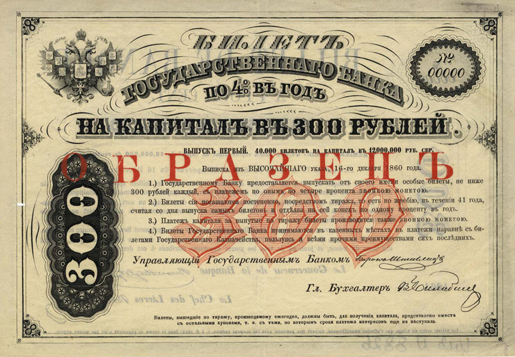 4%-ый билет Государственного банка на капитал 300 рублей. 1861 год. Образец