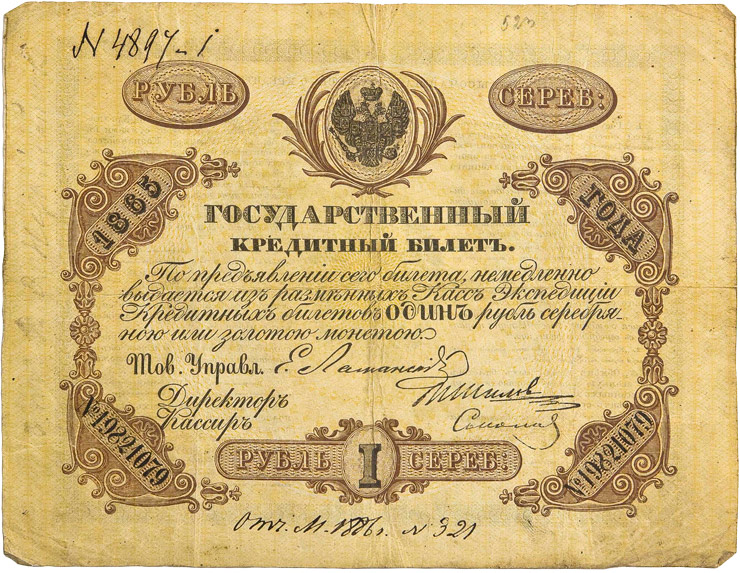 Государственный кредитный билет один рубль, с факсимиле подписи «товарища» (заместителя) управляющего Государственным банком Е.И. Ламанского. 1865 год
