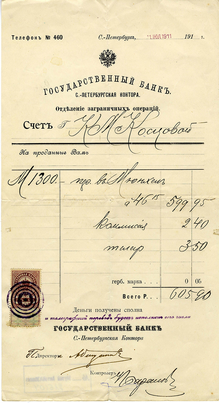 Счет на продажу и перевод иностранной валюты, выписанный Санкт-Петербургской конторой Государственного банка. 1911 год