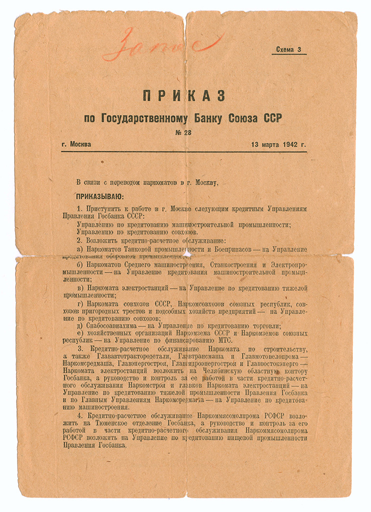 Приказ по Госбанку СССР от 13 марта 1942 года о работе подразделений и территориальных учреждений банка