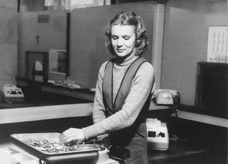 Кассир Госбанка СССР пересчитывает разменные монеты. Фото. 1982 год