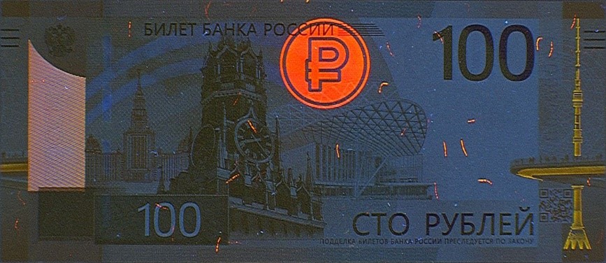 На однотонном поле, содержащем слово «РОССИЯ», при наблюдении под острым углом к поверхности банкноты появляется число «100», каждая цифра которого имеет свою окраску. При повороте банкноты на 180º (без изменения угла зрения) окраска каждой цифры меняется.