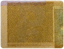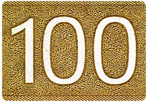 На однотонном поле при наблюдении под острым углом к поверхности банкноты появляется число «100», каждая цифра которого имеет свою окраску. При повороте банкноты на 180º (без изменения угла зрения) окраска каждой цифры меняется.