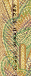 Банкнота имеет два серийных номера, расположенных на лицевой стороне банкноты и состоящих из двухбуквенного обозначения серии и семи цифр.