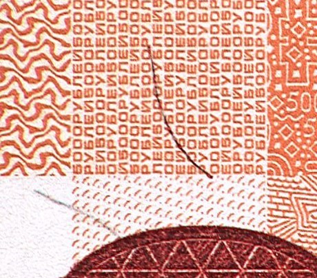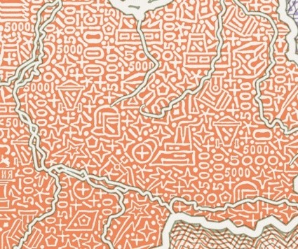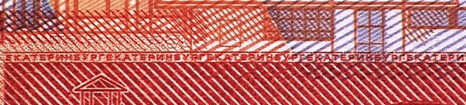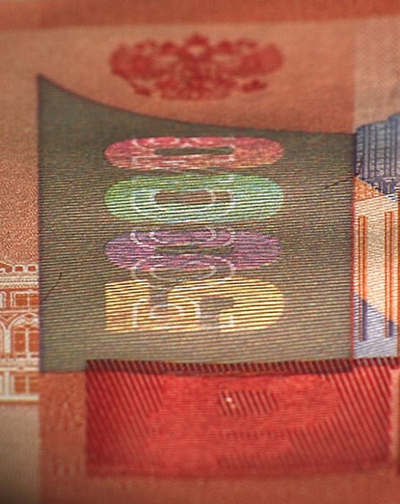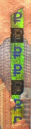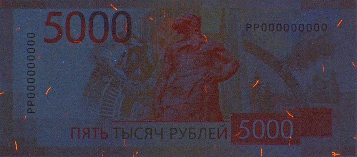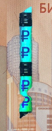Голографическая защитная нить шириной 5,5 мм выходит на поверхность лицевой стороны банкноты в окне фигурной формы.