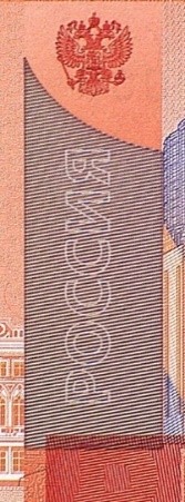 На лицевой стороне банкноты слева вверху расположен герб Российской Федерации.