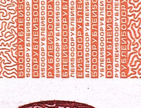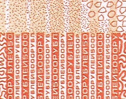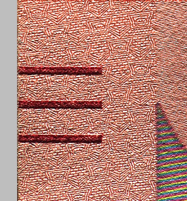 В бумагу внедрены защитные волокна двух типов — цветные с чередующимися участками красного и синего цветов и волокна серого цвета.