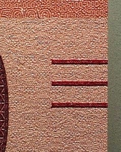 Банкнота имеет два серийных номера, расположенных на оборотной стороне и включающих двухбуквенное обозначение серии и девять цифр номера. Левый номер имеет читаемость по короткой стороне банкноты, правый — по длинной стороне.