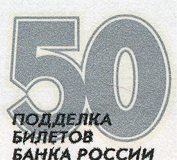 защитной нити видны повторяющиеся сочетания букв и цифр «ЦБР 50», имеющие