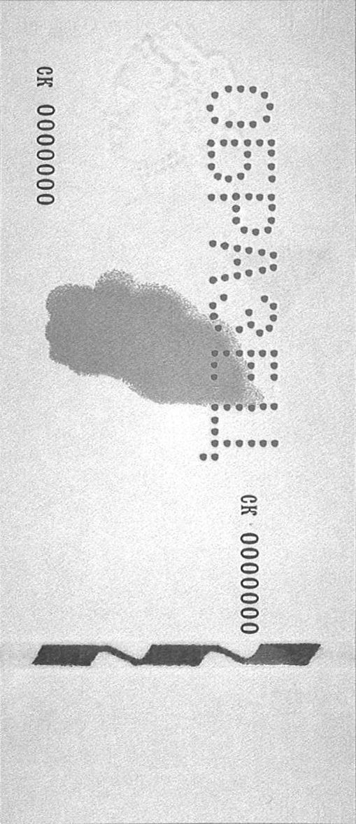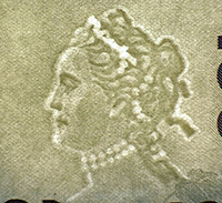 В бумагу внедрена защитная нить шириной 5 мм. При наблюдении на просвет нить выглядит как темная полоса со светлыми повторяющимися изображениями символа рубля на ней, выполненными микродеметаллизацией.