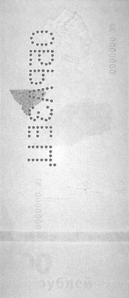 При рассматривании банкноты под острым углом на орнаментальной полосе виден символ рубля. В зависимости от расположения банкноты символ рубля выглядит светлым на темном фоне или темным на светлом фоне.
