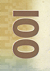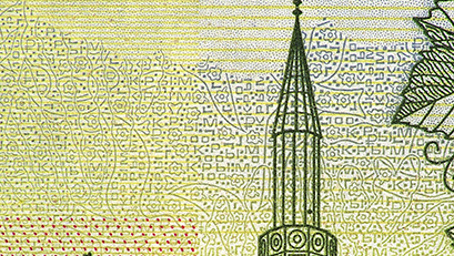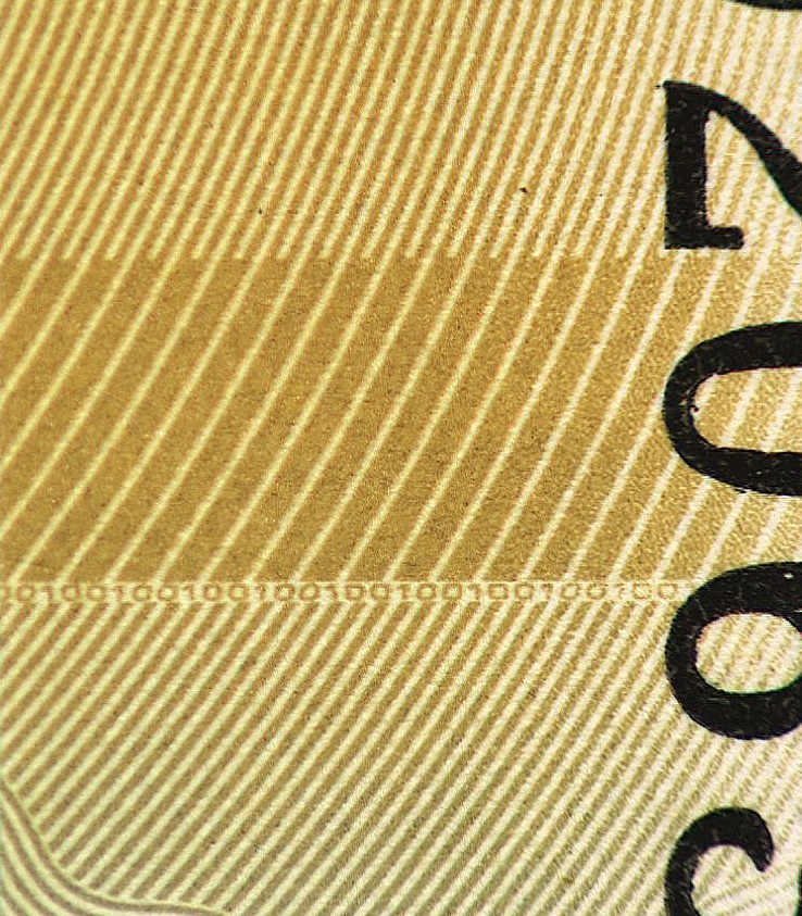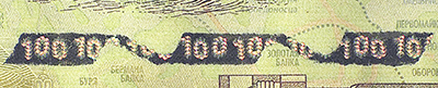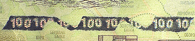 Микротекст, расположенный слева и справа в верхней части банкноты на границах графических элементов, состоит из повторяющегося числа «100».