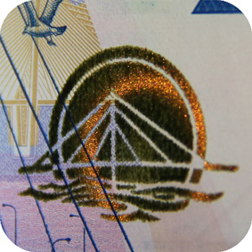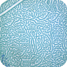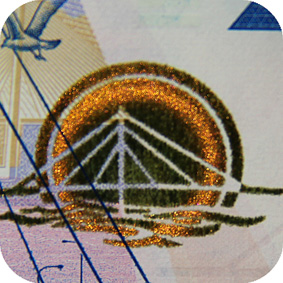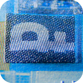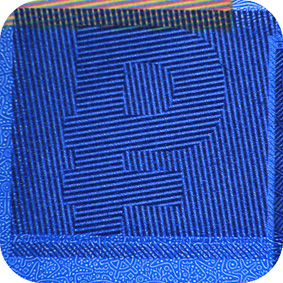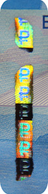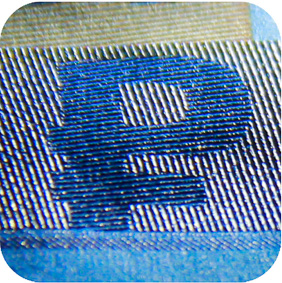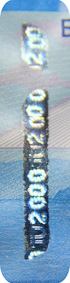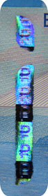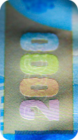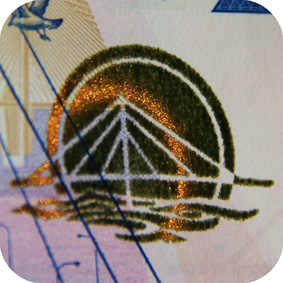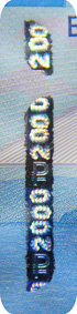 The banknote paper contains two types of security fibres: coloured, with alternate sections of red and blue, and grey ones.