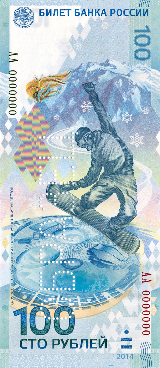 The front of the note features a snowboarder and some of the Olympic venues of the Sochi coastal cluster.