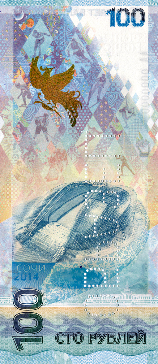 The back of the note features the Fisht Olympic stadium in Sochi.