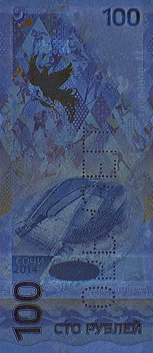 The microtext printed below the Sochi Marine Passenger Terminal on the back of the note, shows the numeral “100” printed repeatedly in a line.