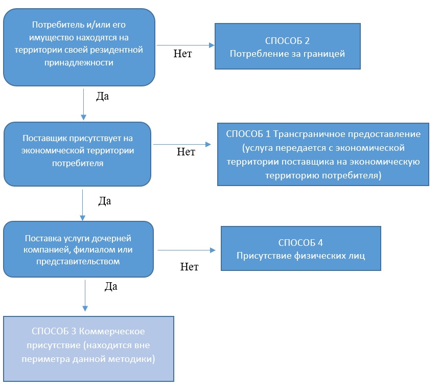 Способы поставки услуг определяются исходя из места нахождения поставщика и потребителя на момент предоставления услуги с учетом их национальной принадлежности или страны происхождения.